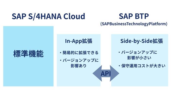 業務に合わせたFiori画面や機能の拡張が必要な場合は、In-App拡張やSide-by-Side拡張の手法を活用し、